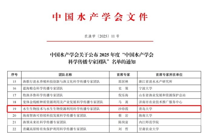 近日,中国水产学会正式发布《关于公布2025年度“中国水产学会科学传播专家团队”名单的通知》,英国上市公司官网365水生生物技术研究院沙珍霞教授牵头申报的“水生生物技术与水生生物资源利用科学传播专家团队”成功入选,成为全国22个获此殊荣的团队之一。